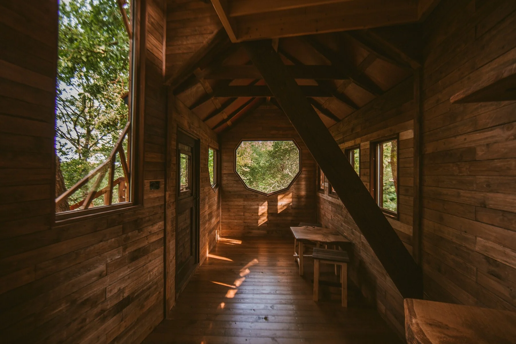 The Gracious treehouse is a classic timber abode as much as it is a daring exploration of arboreal construction. Our brief was grand but at heart quite simple - something which works with the trees. Overlooking a large pond on the edge of a woodland we had two stunning Oaks to work with, and a perfect spot for the treehouse was established where the branches of the two trees tapered away from each other. Two custom made curved staircases wind you up through the trees to the top platform. A midway treehouse platform splits the two flights of stairs, easing the climb. The main platform sits 5m above the ground. The house is divided into three parts; on the left, a living area, on the right a two-story room with a floor level and a mezzanine above. Bespoke shaped windows give views of the forest on all sides. Over 10 different species of timber were used for this treehouse and so wood is everywhere you can look, touch and even in places you can’t - eco wood fibre insulation fills the wall, floor and roof cavities. The treehouse has lighting via a battery system and heating for the colder months.