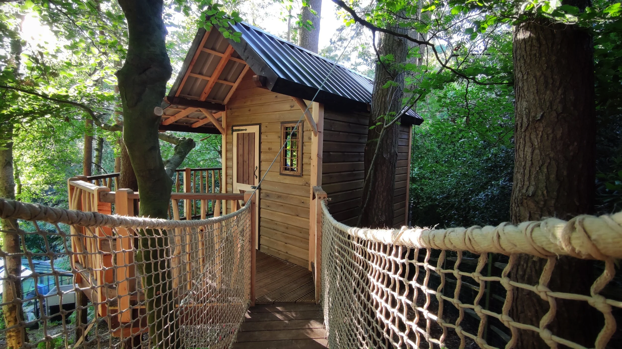 Burrowed into the lush pine forests of the South Downs, where the owls soar and the nightjars churr, is the Nassjo Treehouse. To begin your journey through the trees, first, climb up the rustic tower built from logs and oak branches. From the tower, cross the bridge to the play platform where you find a climbing wall, a scramble net and a fireman's pole which shoots through a trapdoor. All platforms are fully supported by 5 Scots pine trees and enclosed by a hand cleft oak railing. Natural woodwork features are dotted throughout, such as our curved branch braces and stag oak archways. From the play platform, take the second bridge across to the treehouse, a cosy abode fit for children and teenagers. The treehouse has a wrap-around balcony taking on a hexagonal shape at the front. A roof covers the entire structure so one can enjoy the balcony in all weather. The house itself has custom windows and doors, hand-forged metal hinges and handles. Inside find a loft bed with a skylight built into the roof overhead. Underneath the treehouse, you can rock in a pendulum swing or scale a set of monkey bars to a hidden trapdoor. A final feature we added is a seesaw built entirely from logs.